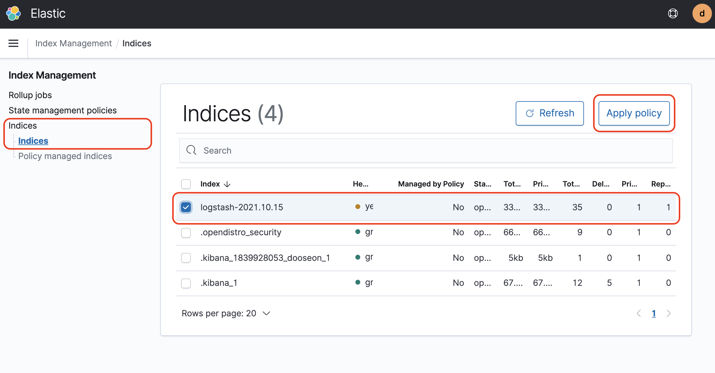 메뉴 'Indices'에 기존에 만들었던 인덱스에 정책을 적용하기 위해서 아래와 같이 적용 인덱스를 선택하고 'Apply policy'를 선택합니다.