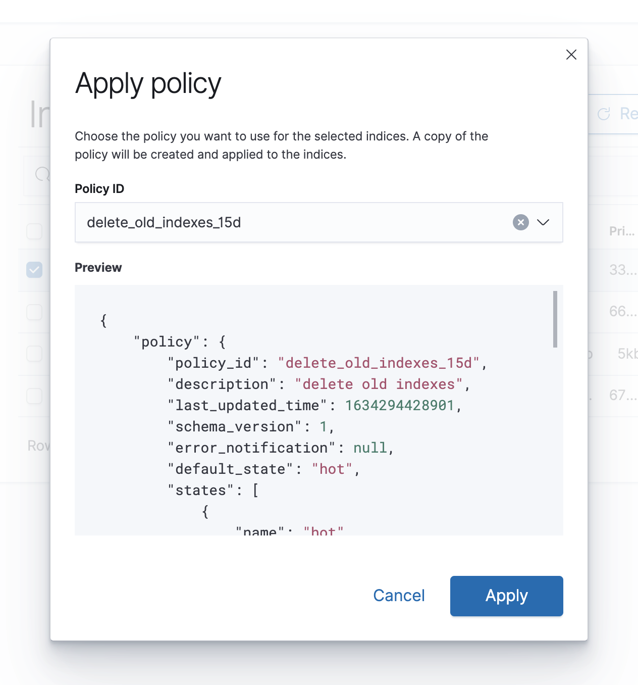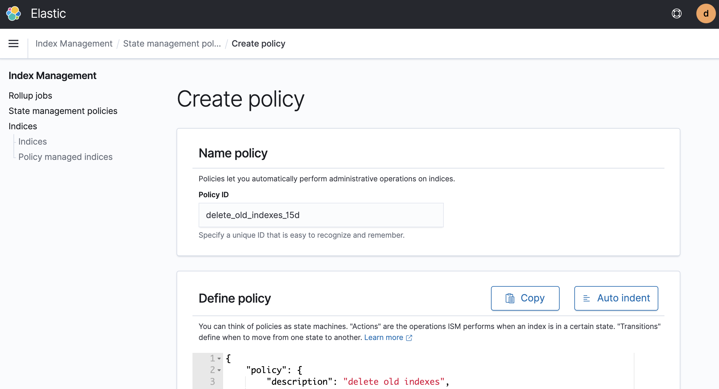 'Define policy'는 15일 지난 Index에 대해서 삭제하라는 내용입니다.