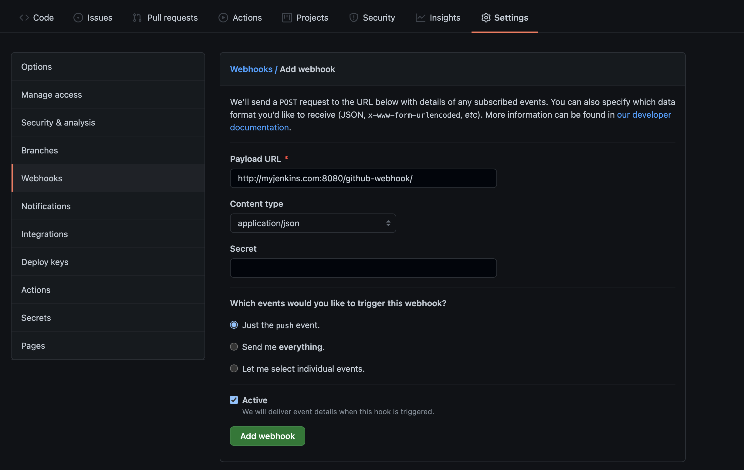 Payload URL : Jenkins URL을 등록합니다. 외부에서 접근할 수 있는 URL이 필요합니다. 형식은 Jenkins URL 뒤에 /github-webhook/을 붙이면 됩니다.