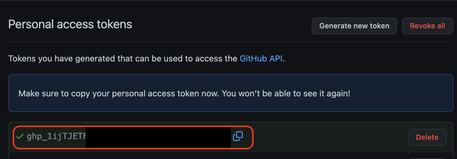 생성된 토큰이 표시되면 복사해 둡니다. 토큰은 한 번만 표시되고 더 이상 볼 수 없으므로 분실했을 때는 다시 발급받아야 합니다.