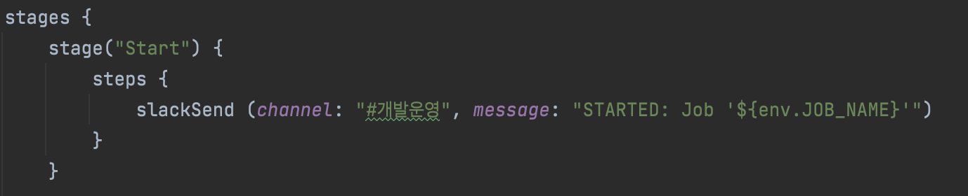 slackSend (channel: "#개발운영", message: "STARTED: Job '${env.JOB_NAME}'")