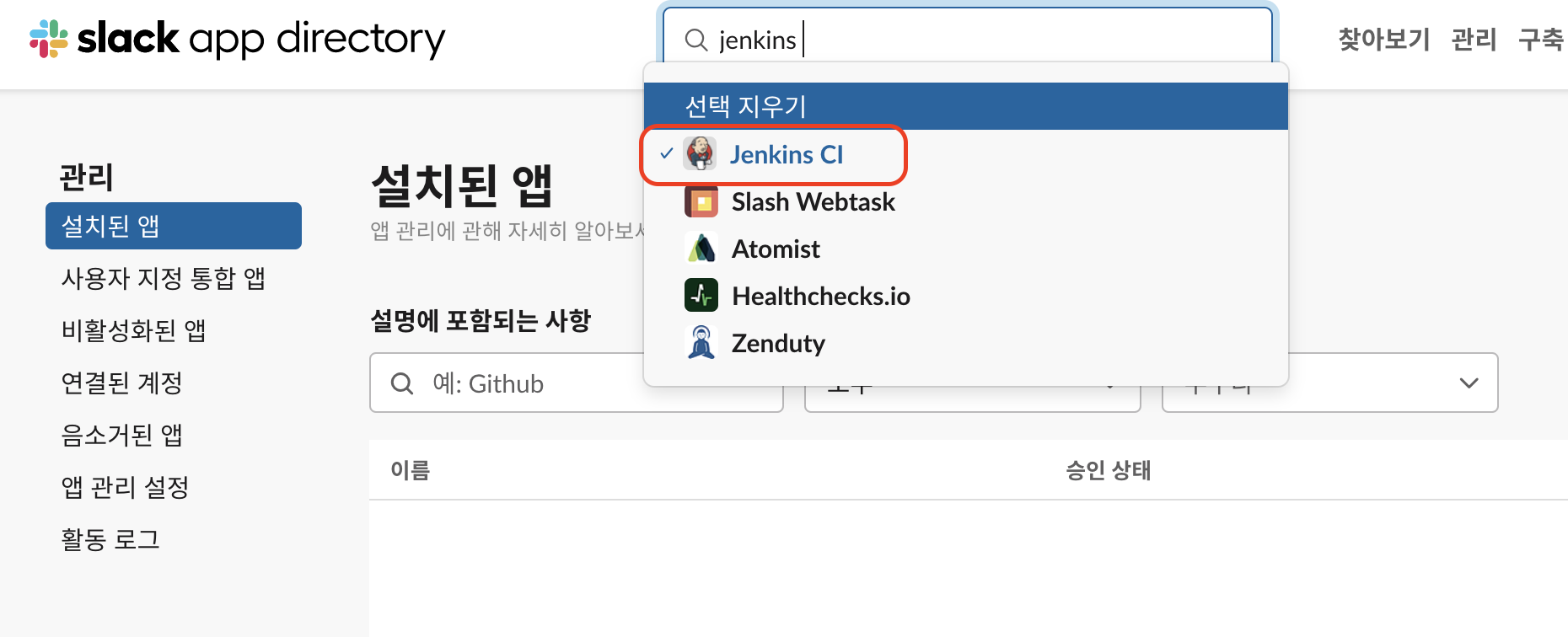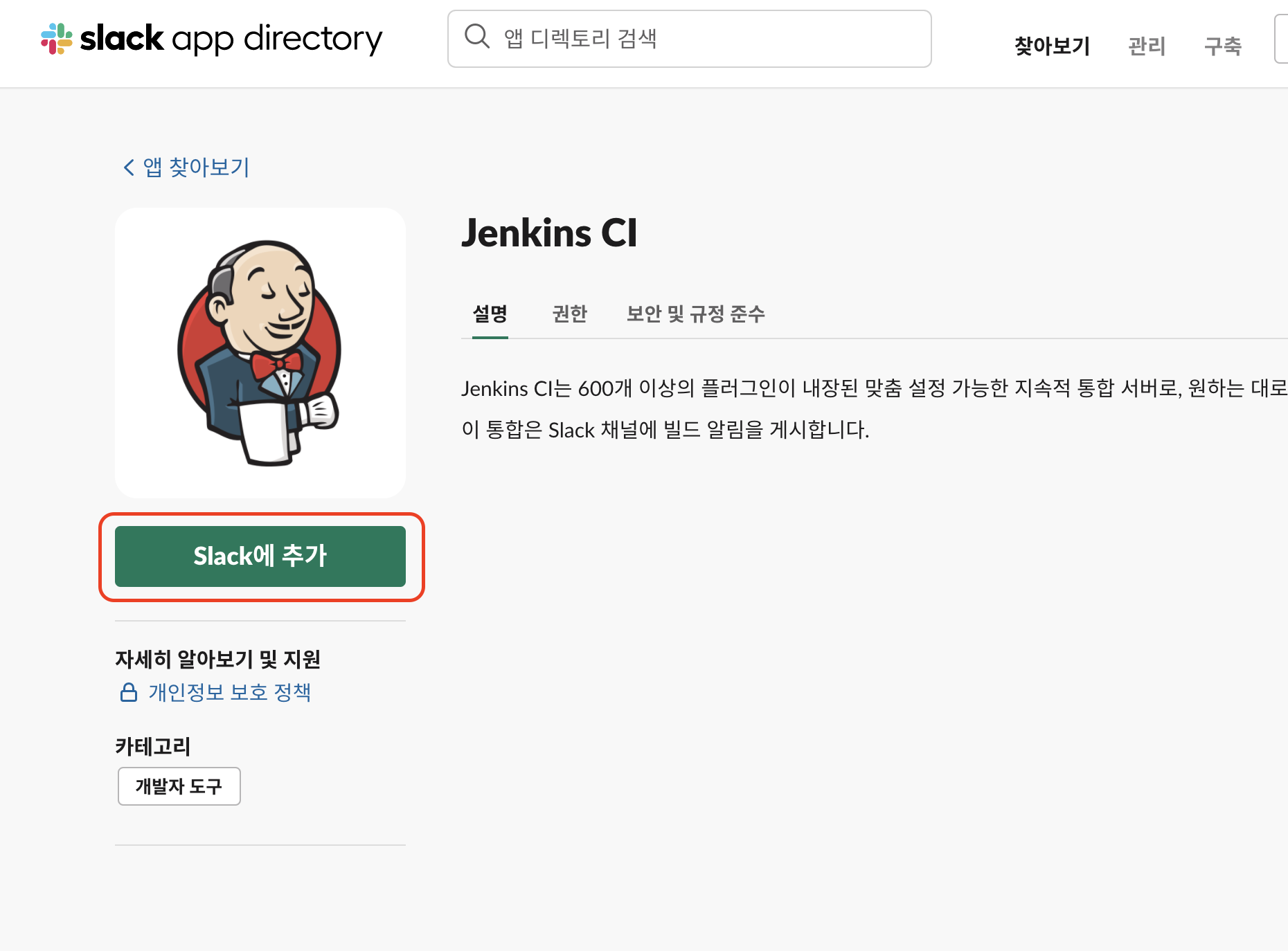 웹으로 이동 후 'jenkins ci'으로 검색하여 앱을 설치합니다.