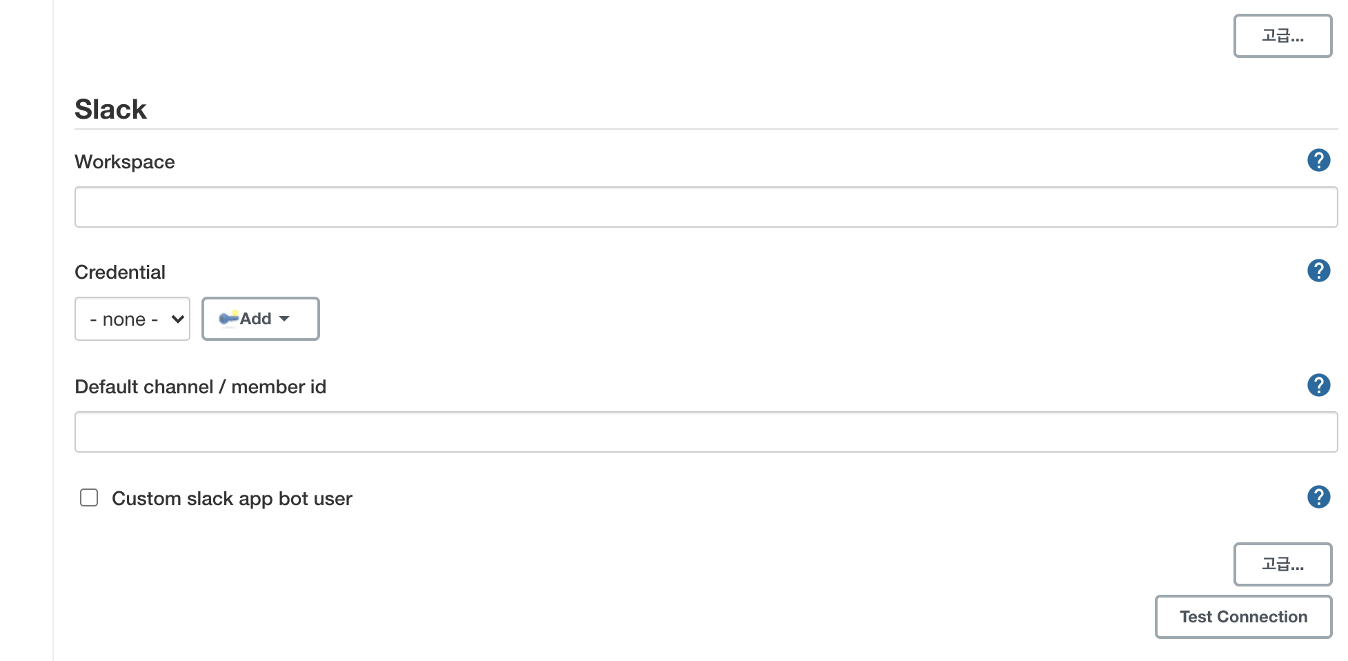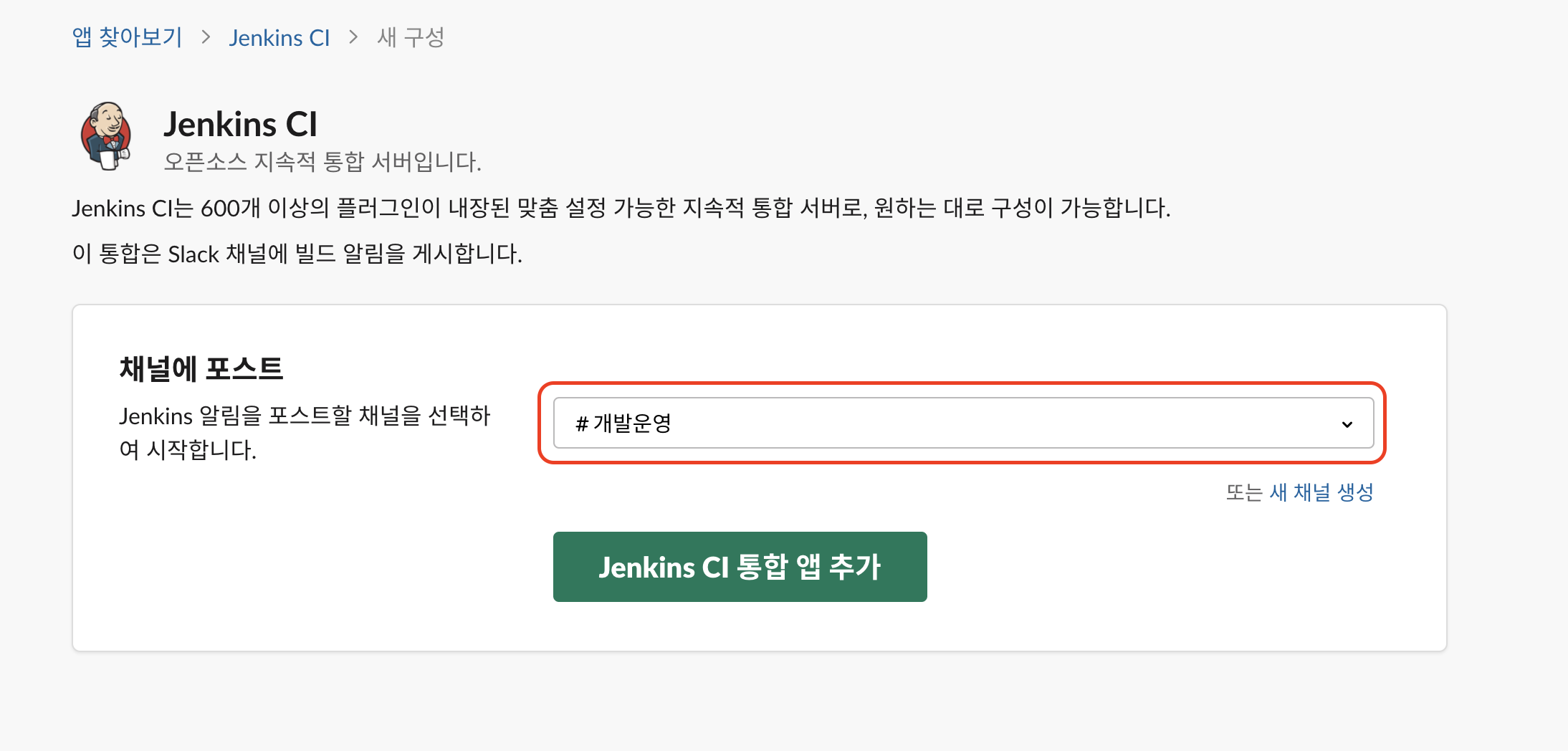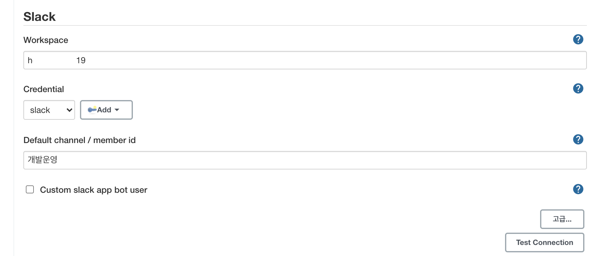 사용하려는 슬랙 Workspace 이름과 기본으로 사용할 채널 이름을 입력합니다.