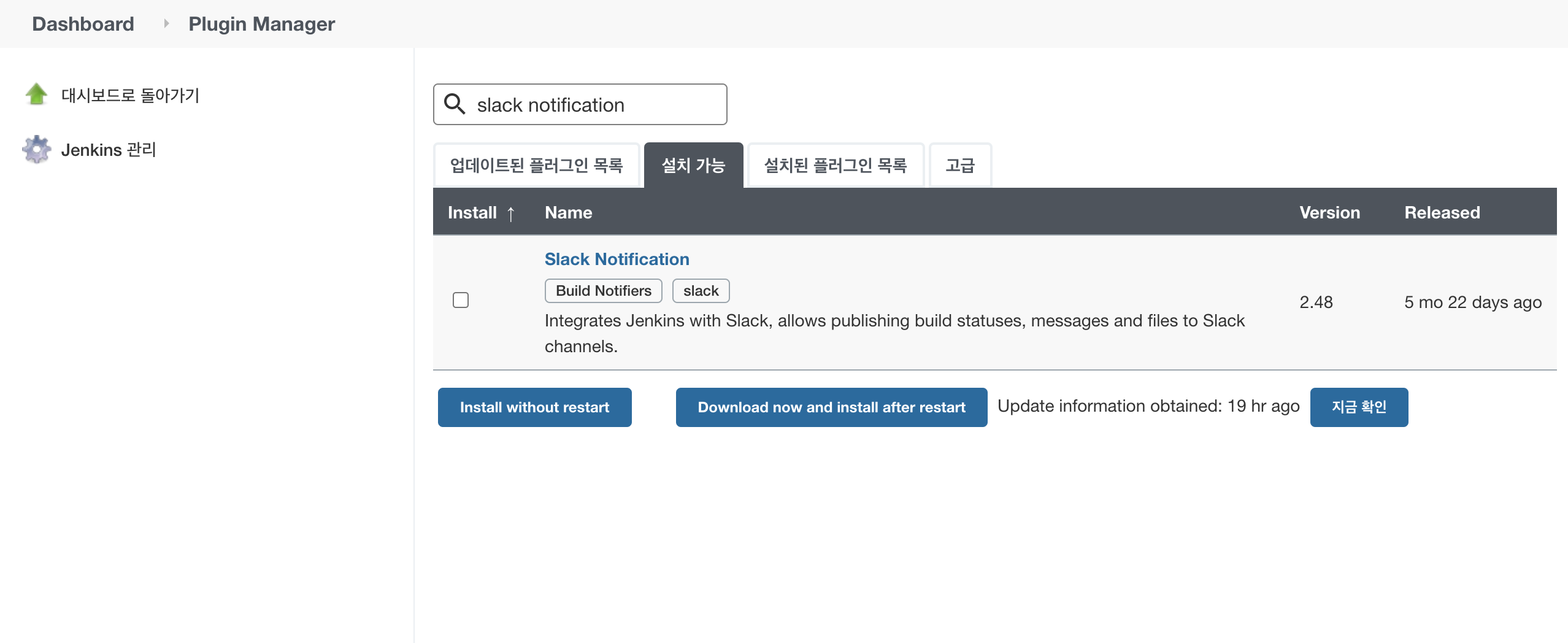 젠킨스로 돌아와 'Slack Notification' Plugin을 설치해 줍니다.