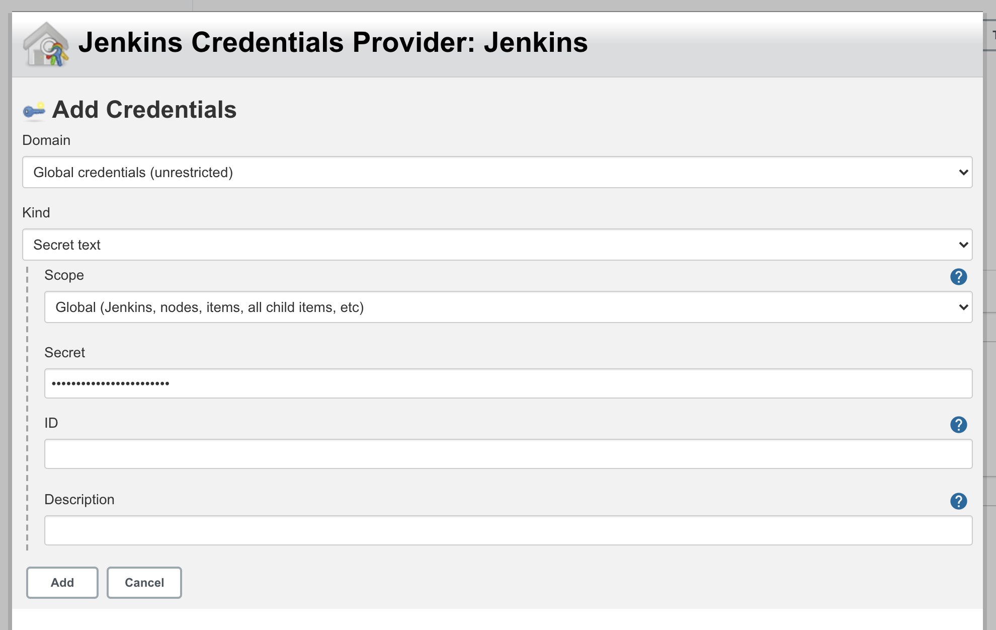 Kind는 'Secret text'를 선택하고 Secret에 슬랙 인증키를 등록합니다. Description에 설명을 입력하고 완료합니다.