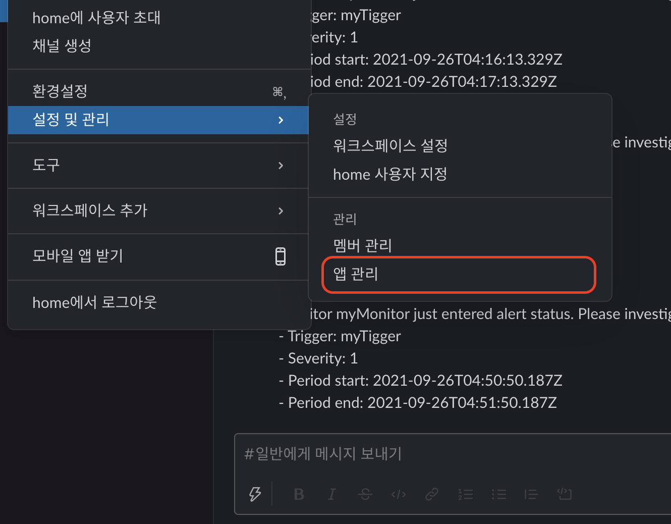 슬랙에서 '설정 및 관리 > 앱관리'로 이동합니다.