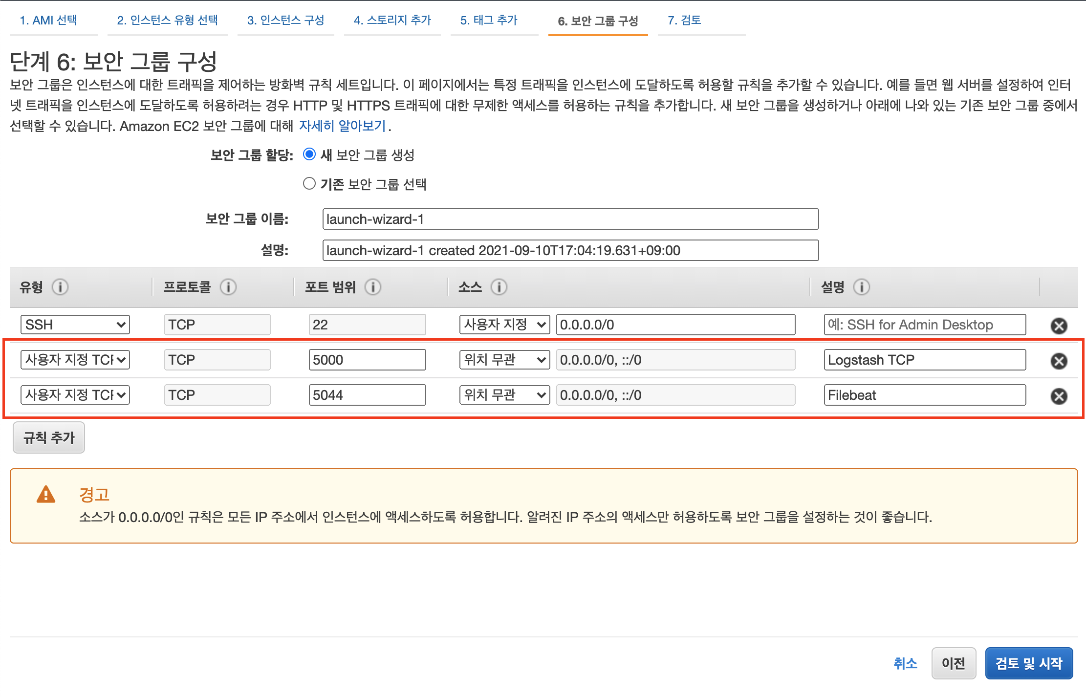 Logstash에서 로그를 받을 때 5000번 포트로 TCP로그를 받고 5044 포트로 Filebeat 로그를 받습니다.