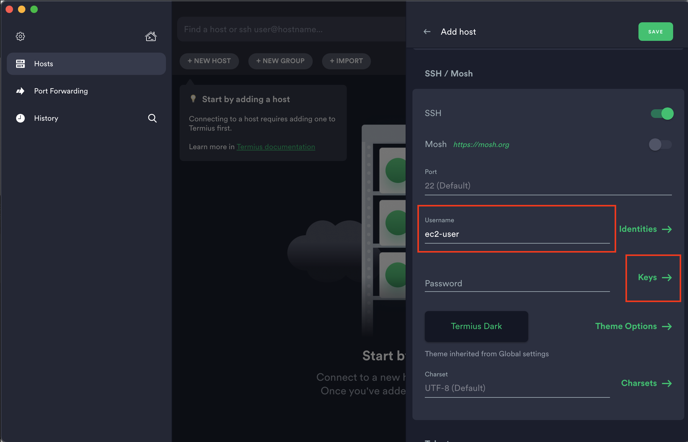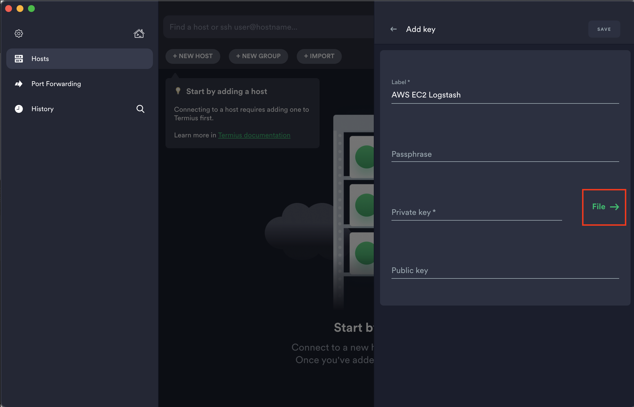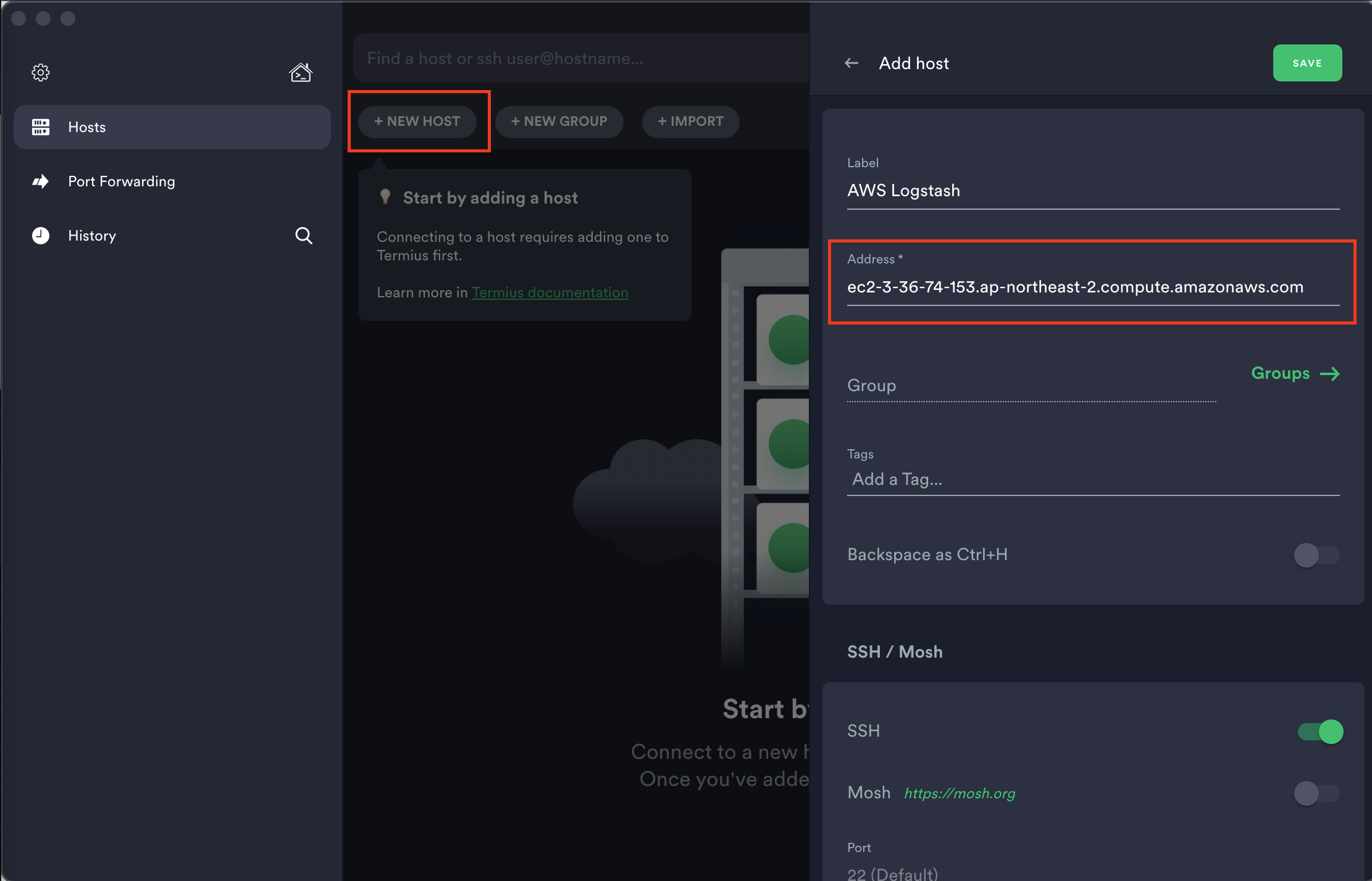 'NEW HOST'로 호스트 등록 창을 열고 'Label'과 EC2 DNS를 입력합니다.