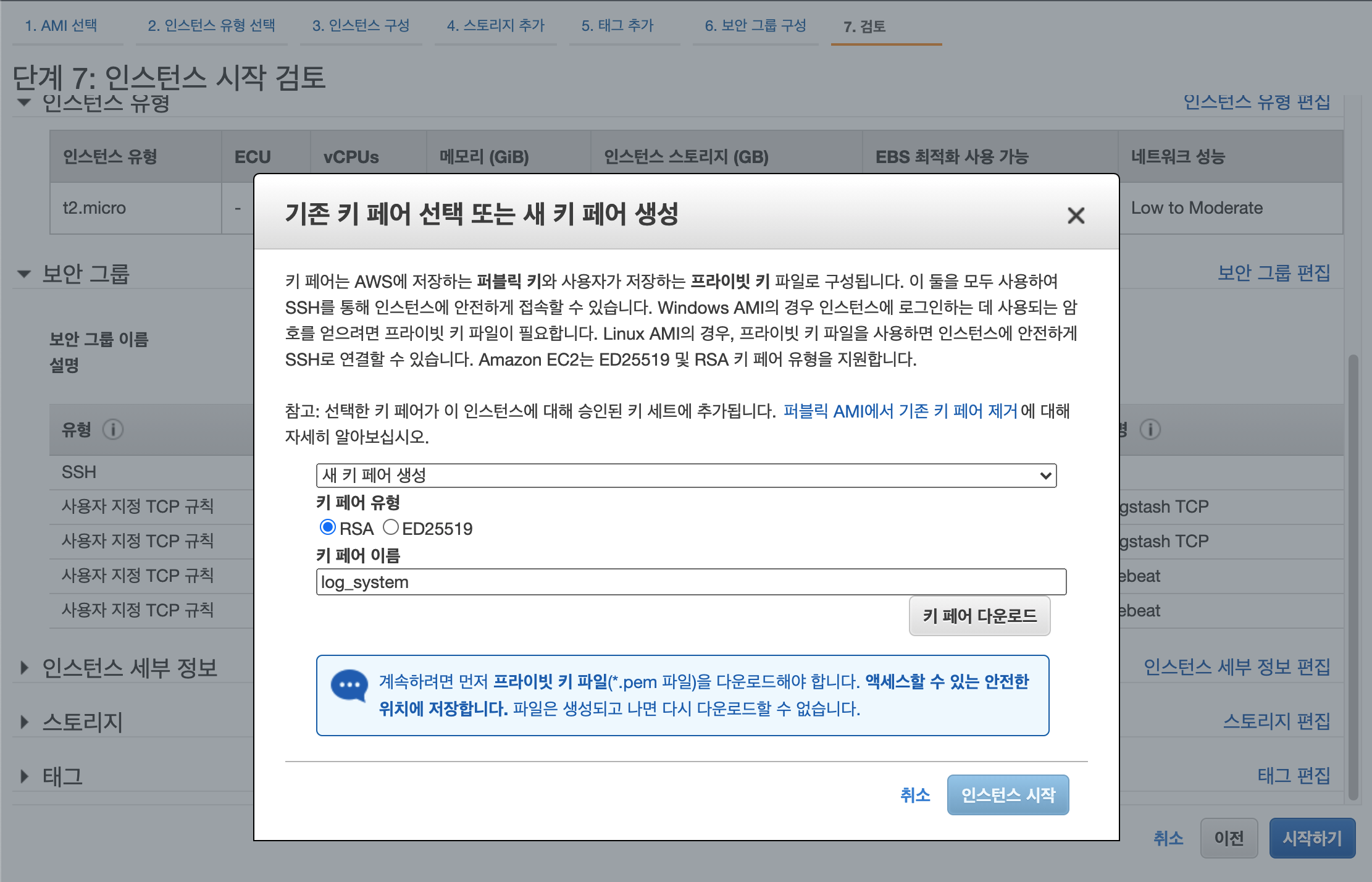 EC2 인스턴스에 SSH로 접속할 때 사용할 키를 생성하여 다운로드하고 '인스턴스 시작'을 클릭합니다.