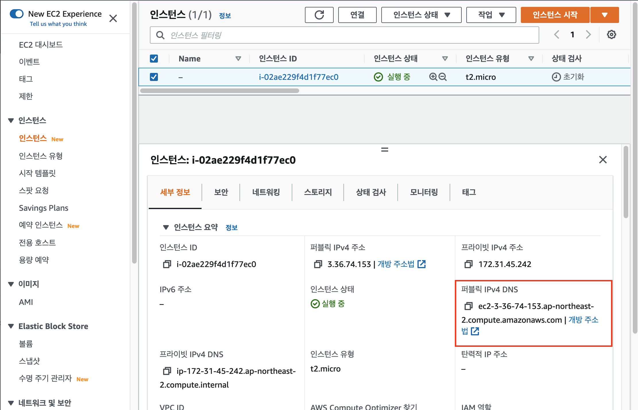 퍼블릭 IP 주소는 인스턴스를 재시작하게 될 경우 변경될 수 있기 때문에 퍼블릭 DNS 주소로 접속합니다.