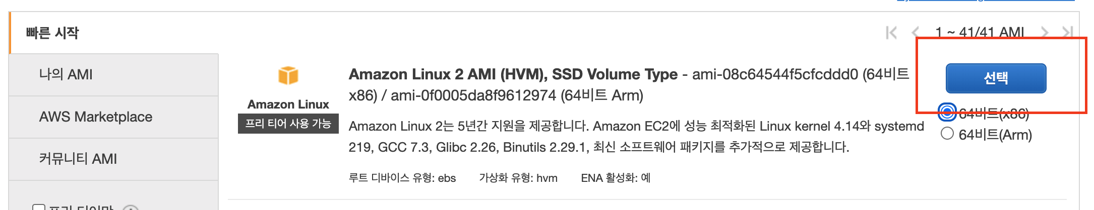 이미지는 Amazon Linux 2 AMI를 선택합니다. 해당 이미지는 AWS 주요 에이전트들이 설치되어 있고 프리티어로 사용할 수 있습니다.