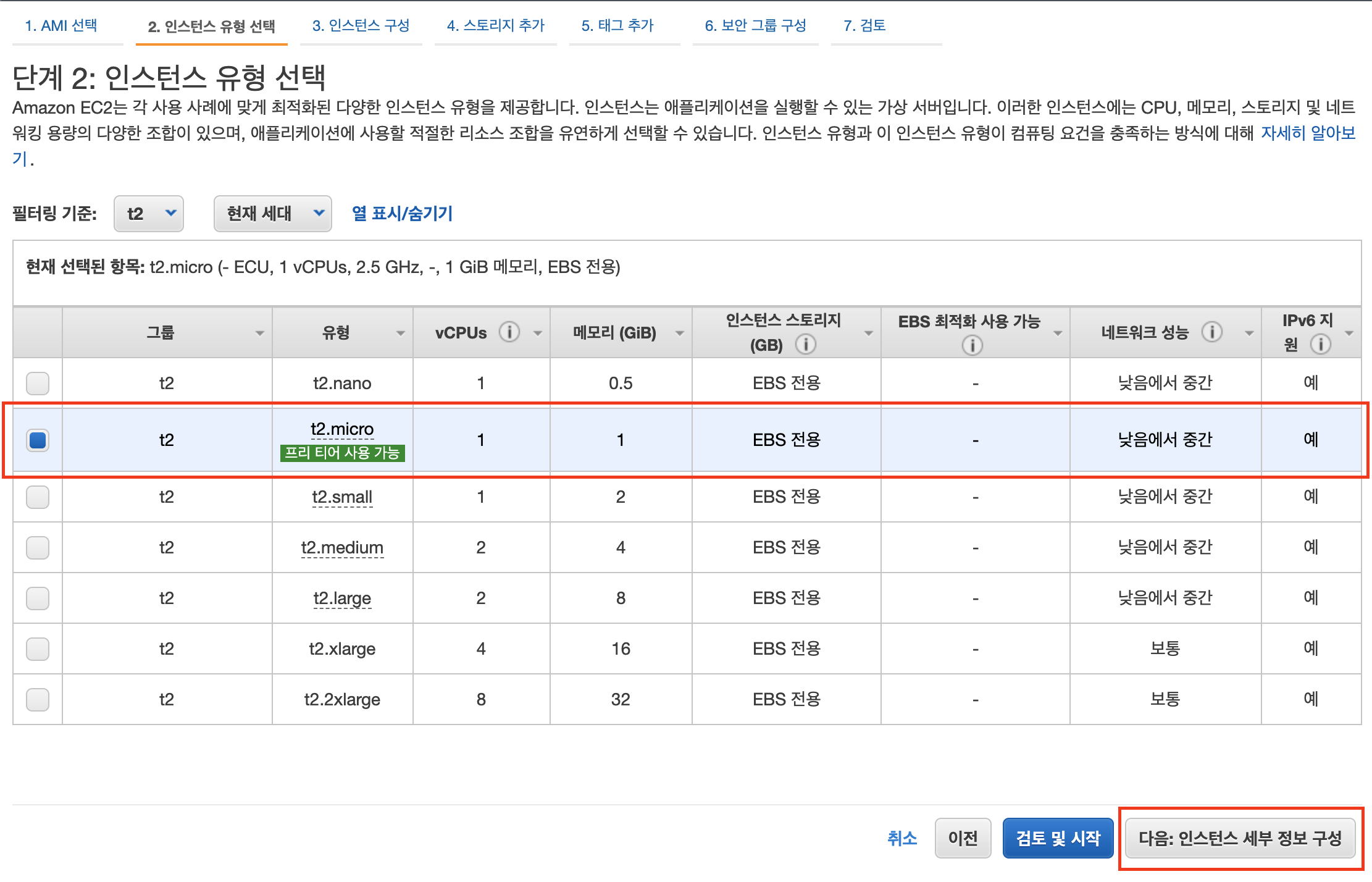 프리티어 사용 가능한 t2.micro를 선택하고 '다음:인스턴스 세부 정보 구성'을 클릭합니다.