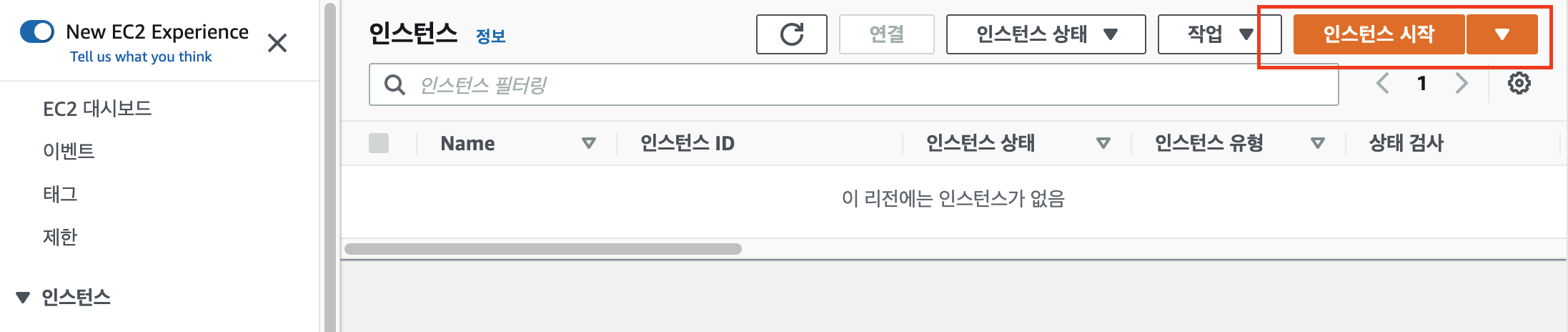 AWS 'EC2' > '인스턴스'에서 새로운 인스턴스를 생성합니다.