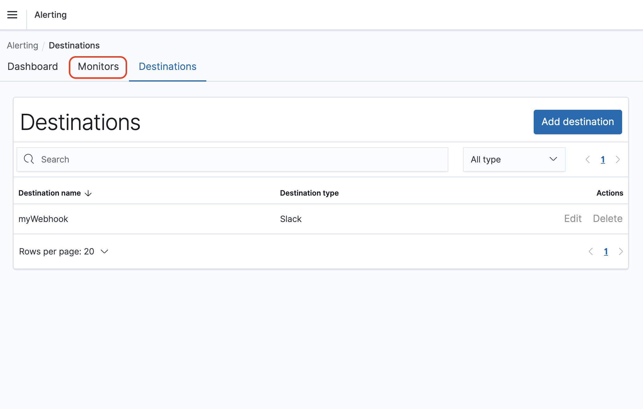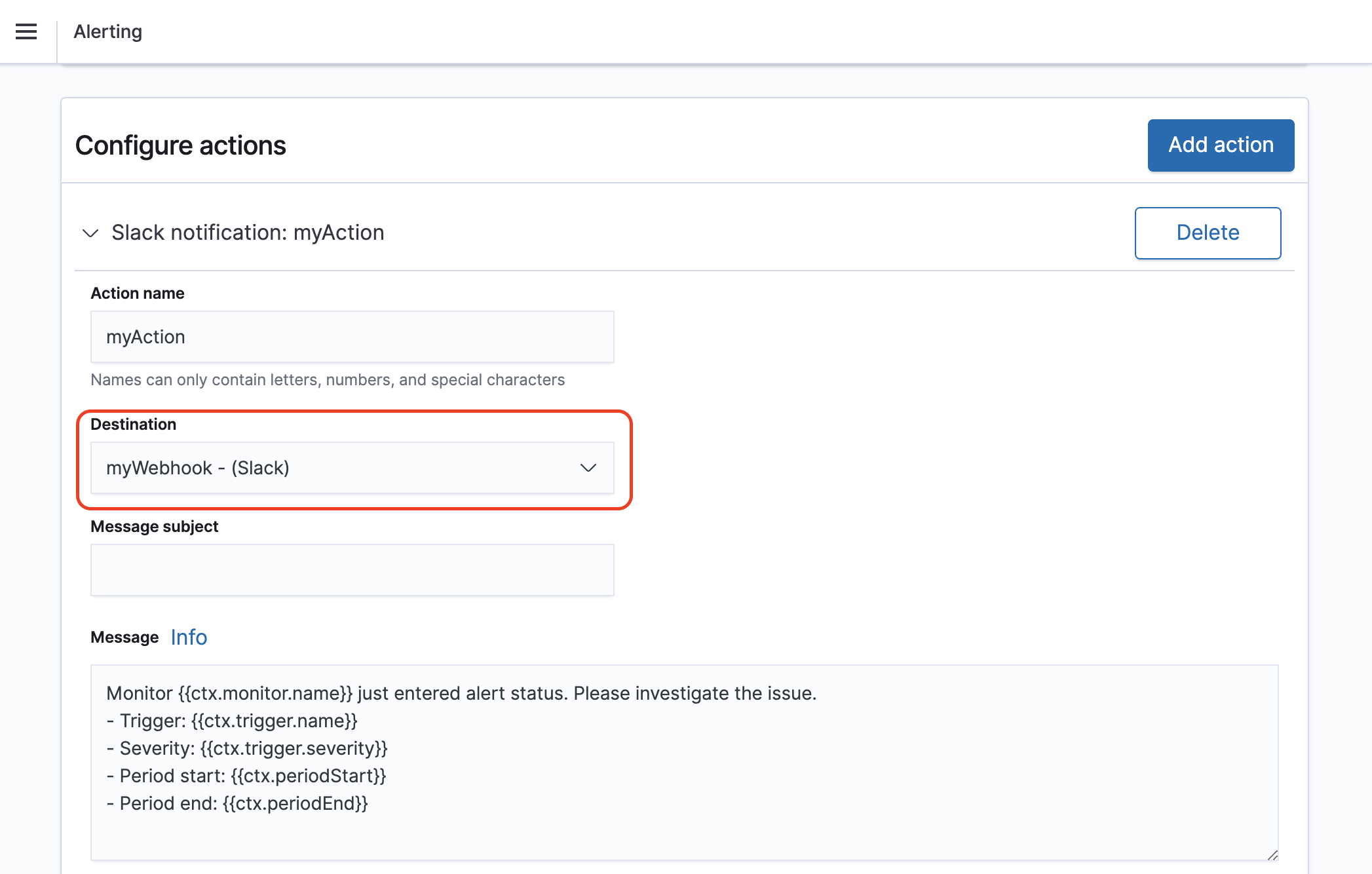 Configure actions 에서 'Action name'을 설정해주고, 'Destination'에서 미리 설정해둔 slack destination을 선택합니다. 마지막으로 'Message subject'을 입력해주면 완료됩니다.